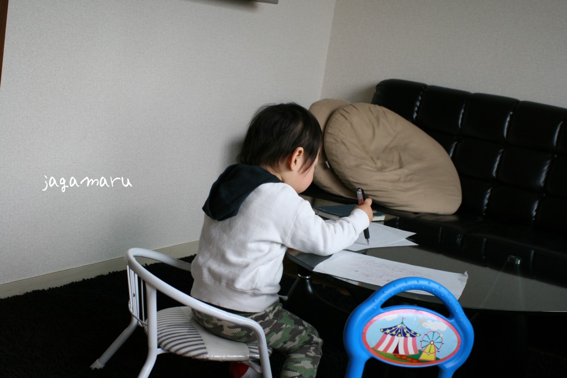 珍しく、イスに座ってお絵かきです
